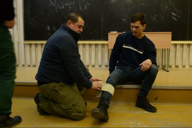 Семён продемонстрировал как накладывать жгут, наматывать чепец, обвязывать бинтом поврежденные конечности. Ребята всерьез задумались о наполнении личной аптечки необходимыми медикаментами и отработке правильных действий по оказанию первой помощи.